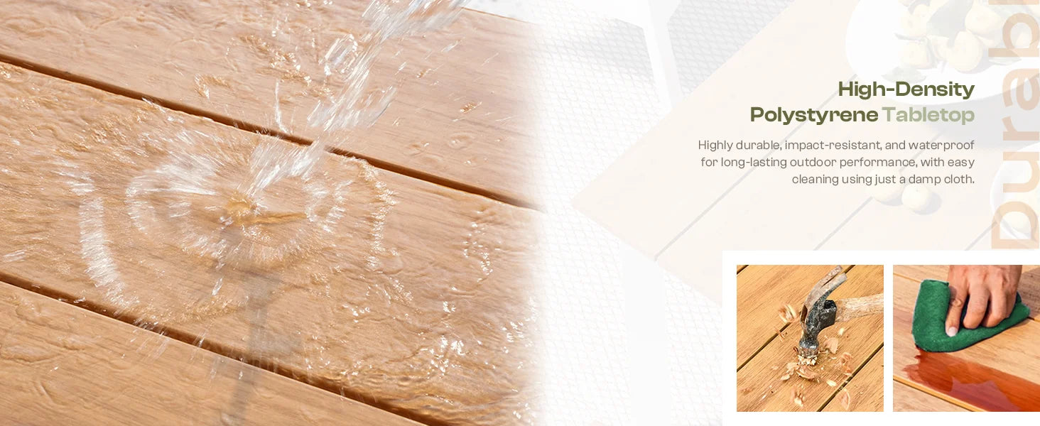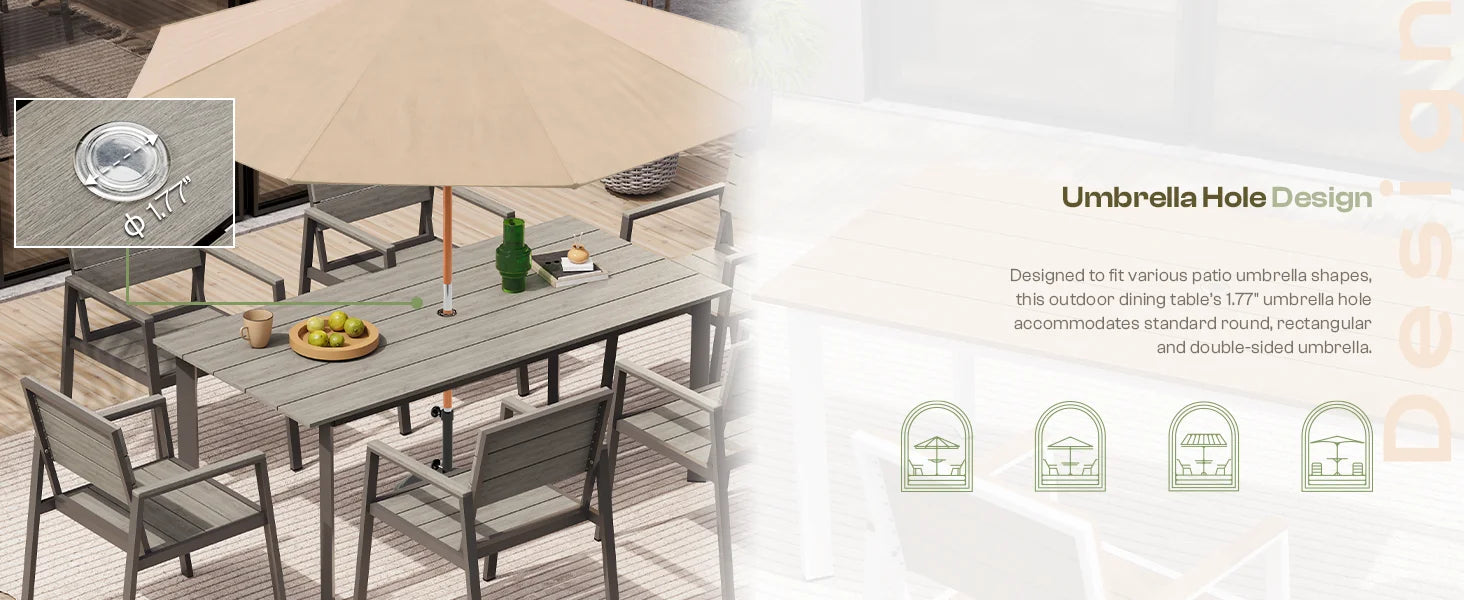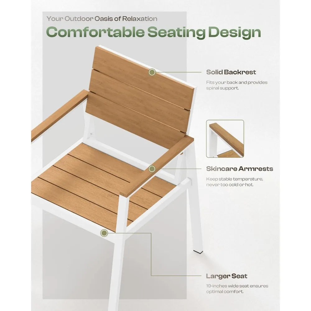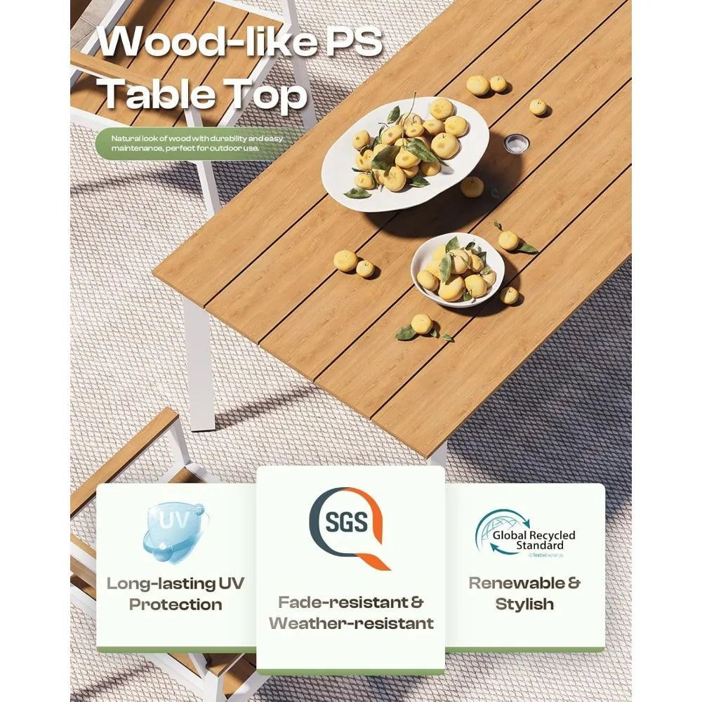 Comfy and Spacious Dining Table Sets:This patio dining chair features a 19" W and 17.5" D, supporting up to 350 lbs, with patio dining table supporting 280 lbs. Skin-friendly HDPS surfaces maintain comfortable temperatures year-round, unlike metal, which absorbs heat and cold. This outdoor dining table has a 1.77" umbrella hole for easy setup, offering a more comfortable outdoor dining experience.