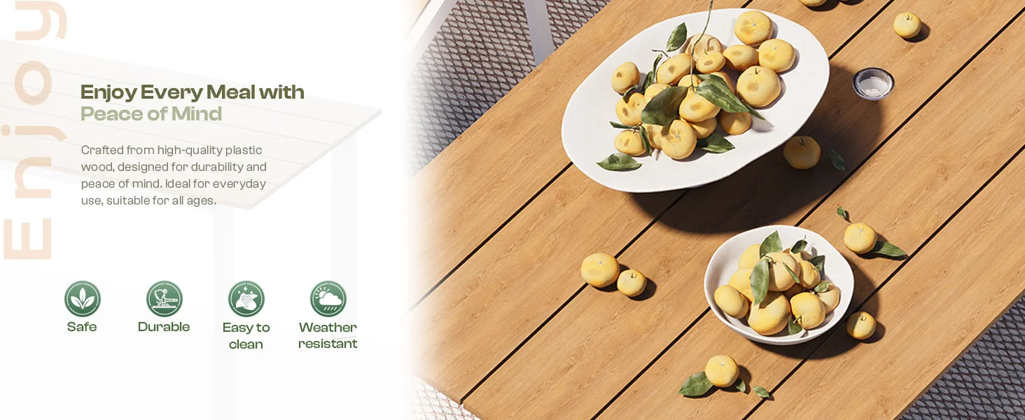 Easy to Move: The Aluminum and HDPS combination makes this patio dining set lighter and easier to move than traditional HDPE furniture, perfect for both indoor and outdoor use. The patio dining table and chairs can meet diverse environmental needs, whether on patio, balcony, garden, or even in living room.
