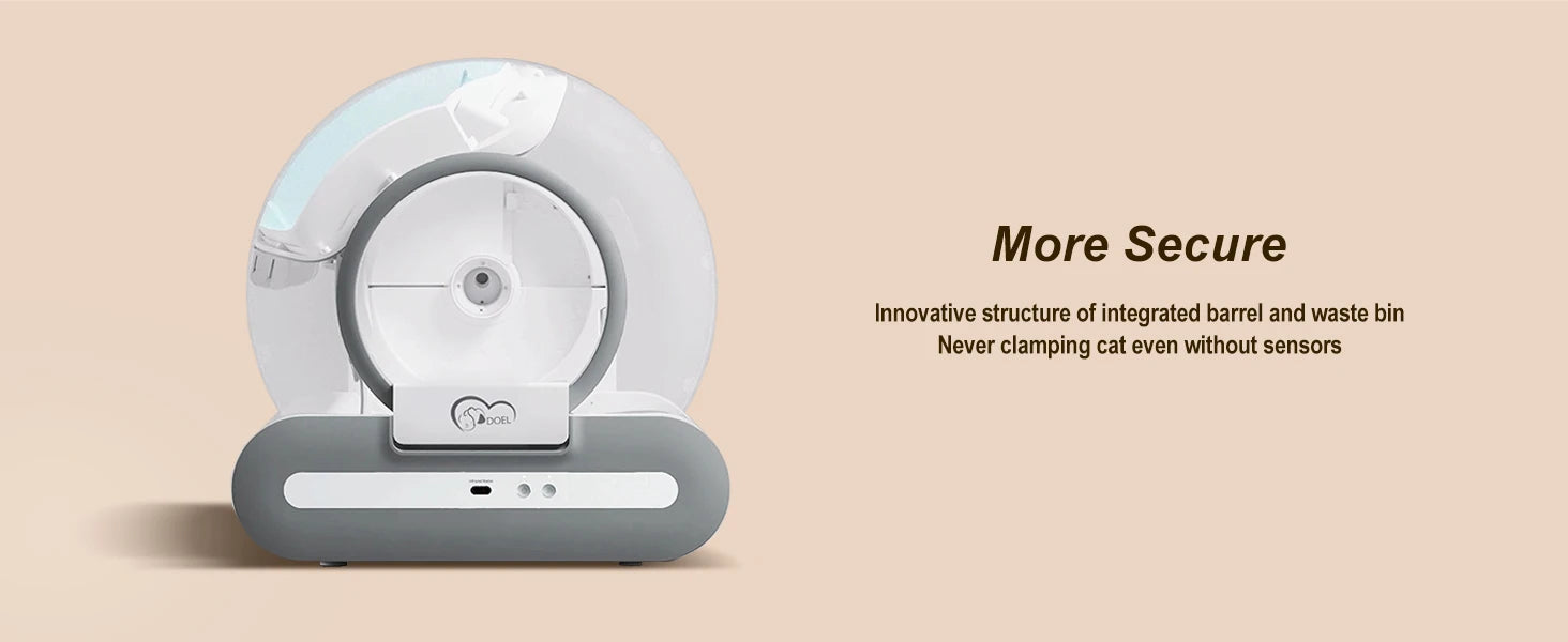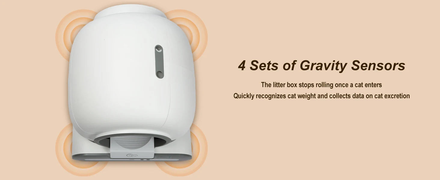 Safety: The bottom of the device is equipped with four gravity-sensing sensors. Information regarding your cat's toileting, including frequency, timing, and weight changes, will be displayed through the application. For accurate monitoring, please place the device on a hard, flat surface, and avoid placing it on top of litter mats/carpets. Additionally, the front-facing infrared sensor can automatically stop rotation when your cat approaches, ensuring your cat's safety.