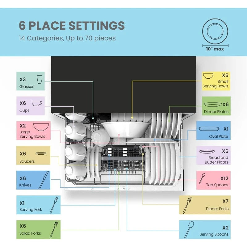 C0MFEE compact dishwasher is suitable for dorms, RVs, and apartments. This countertop dishwasher can fit up to 70 pieces of tableware, and a plate size of up to 10 inches in diameter. This dishwasher can be connected to the faucet directly (adapter not included) or can be flexibly placed on the table or fitted in the cupboard.