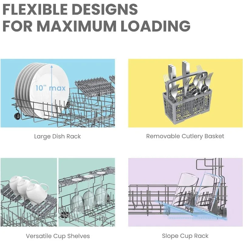 8 Washing Cycles: Most of the cleaning cycles, including Heavy, Normal, Baby-Care, ECO, Glass, and Speed, helped with the extra-drying function, and deliver sparklingly cleaned and dried dishes. Three more cleaning options, including Speed, Mini-party, and Rinse, are designed for C0MFEE' compact dishwasher, providing high flexibility for you to choose in different situations.