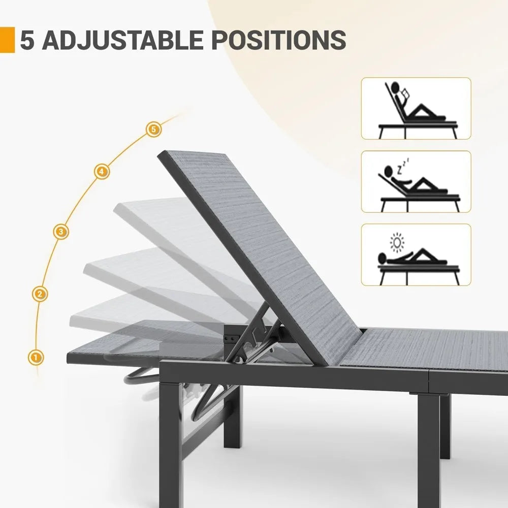 The chaise lounge frame is made of metal, durable, waterproof & rust-proof. Multiple layers of rust-proof and waterproof coating on the surface. Outdoor Chair with 5-Position Adjustable: 5 gears are available for adjustment, you can use it for reading, sitting, and flat lying for every comfortable position you need. Textilene fabric improves durability & breathability, content to a more comfortable experience.