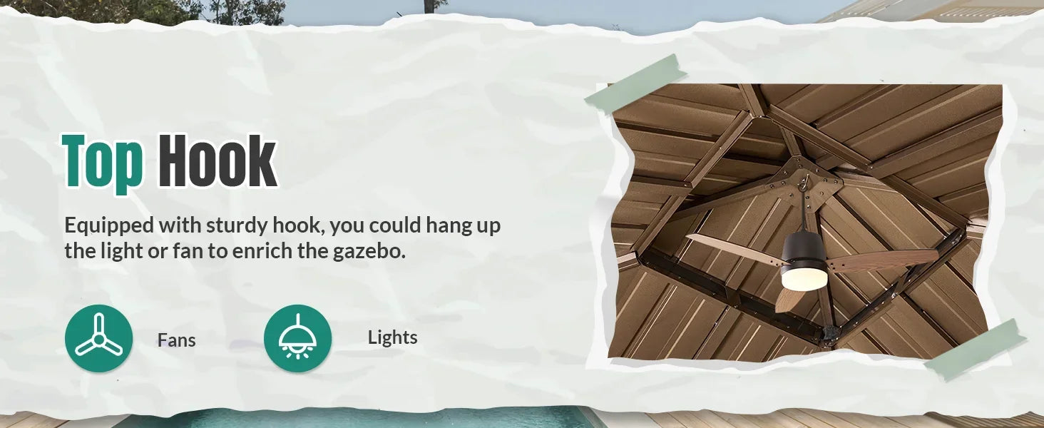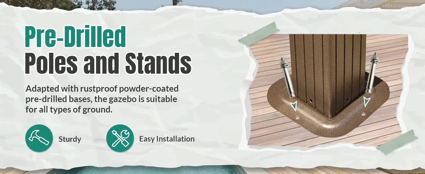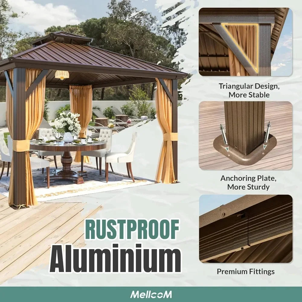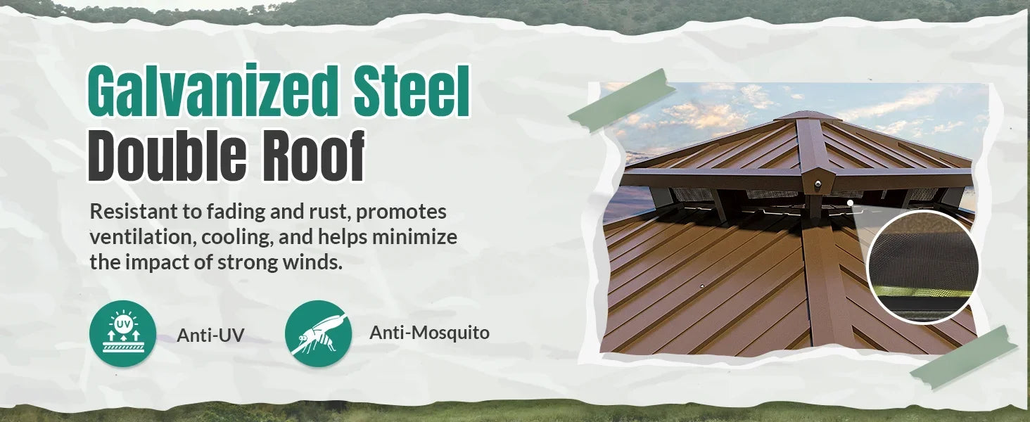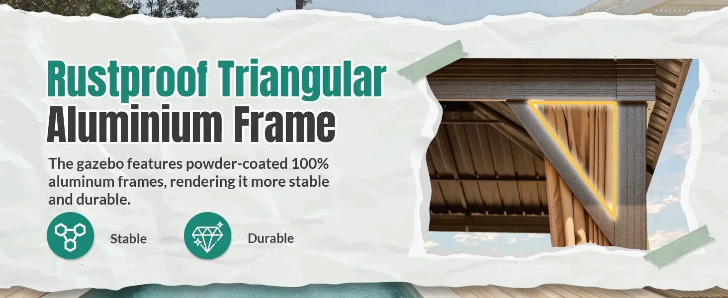 This hard top gazebo is designed for easy assembly, facilitated by its pre-drilled bases and straightforward setup process, ensuring that you can quickly enjoy your gazebo. Featuring a galvanized steel double roof and sturdy 100% aluminum frame, this hardtop gazebo is built to withstand the elements. The roof provides weatherproof protection, resisting fading, rust, and harmful UV rays, while the powder-coated triangular aluminum frames ensure stability and adaptability to diverse surfaces such as decks, concrete, and more.