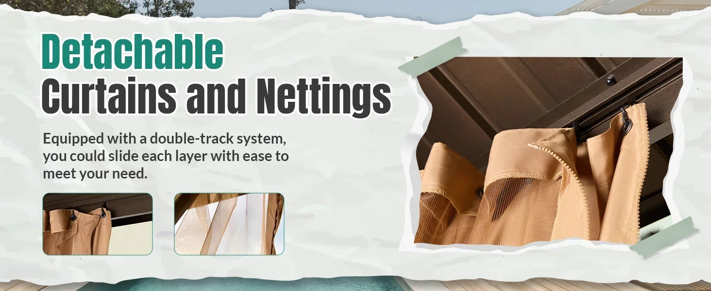 Functional Curtains and Netting: Equipped with removable zippered double-layer waterproof curtains and netting, our canopy gazebo offers privacy, ventilation, and protection from insects. The double-track system allows for effortless adjustment of each layer, ensuring a comfortable and customizable outdoor experience.
