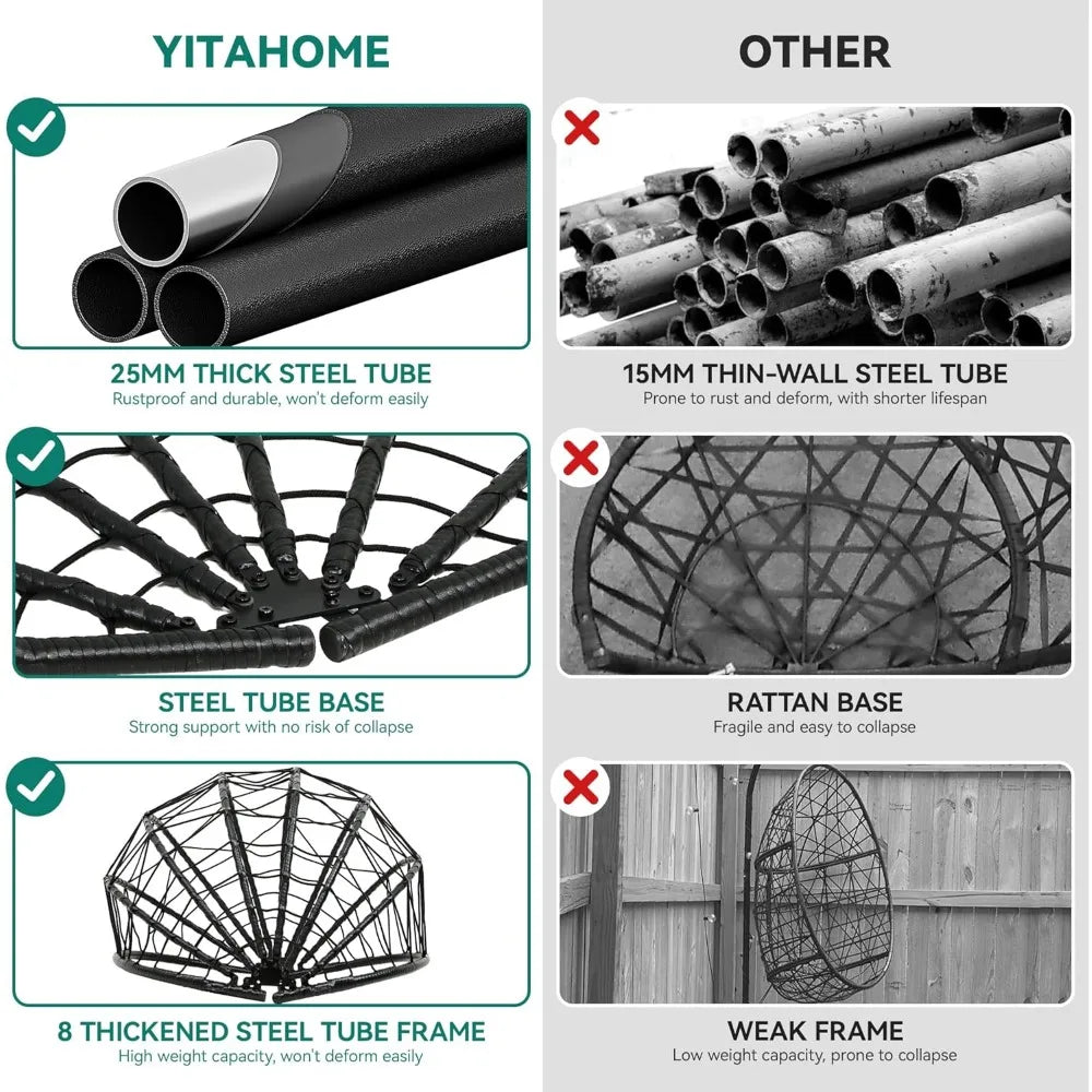 The patio egg chair uses an upgraded version of a soft cushion and a headrest with a stable tripod. You just need to install the tripod according to the instructions and hang the egg chair. It only takes you ten minutes to open it to enjoy the afternoon easily. The spacious and comfortable patio lounge chair is your good partner for leisure time. This chair uses a combination of solid steel frame and rattan to increase strength, is weatherproof and durable, and is equipped with a comfortable and soft PP cotton cushion, so that you can enjoy it while ensuring your safety.