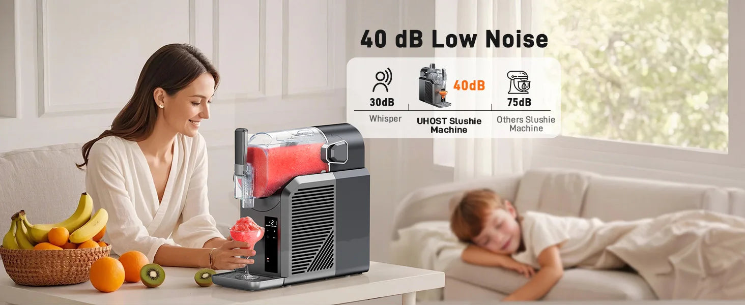 Quiet & Hassle-Free Cleaning: Operating at approximately 40dB, this Slushie Maker lets you create frozen drinks without disrupting conversations or relaxation time. Additionally, the detachable design and dishwasher-safe parts make cleaning easier—ideal for busy households and frequent use.