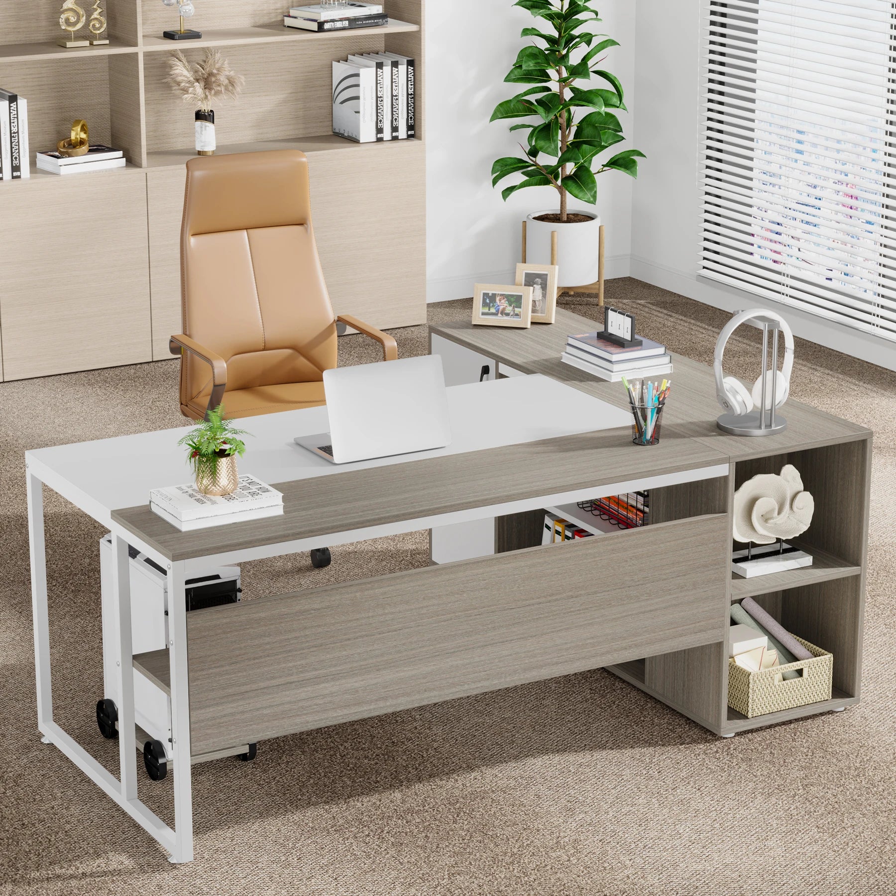 Ample storage Space: Coming with a storage cabinet, printer cabinet, CPU stand, and storage shelves, this executive desk could hold printers, scanners, fax machines, and any other office machines, keeping them within easy reach of your desk to free up work space. With powerful storage space, this L-shaped computer desk can meet different storage needs.
