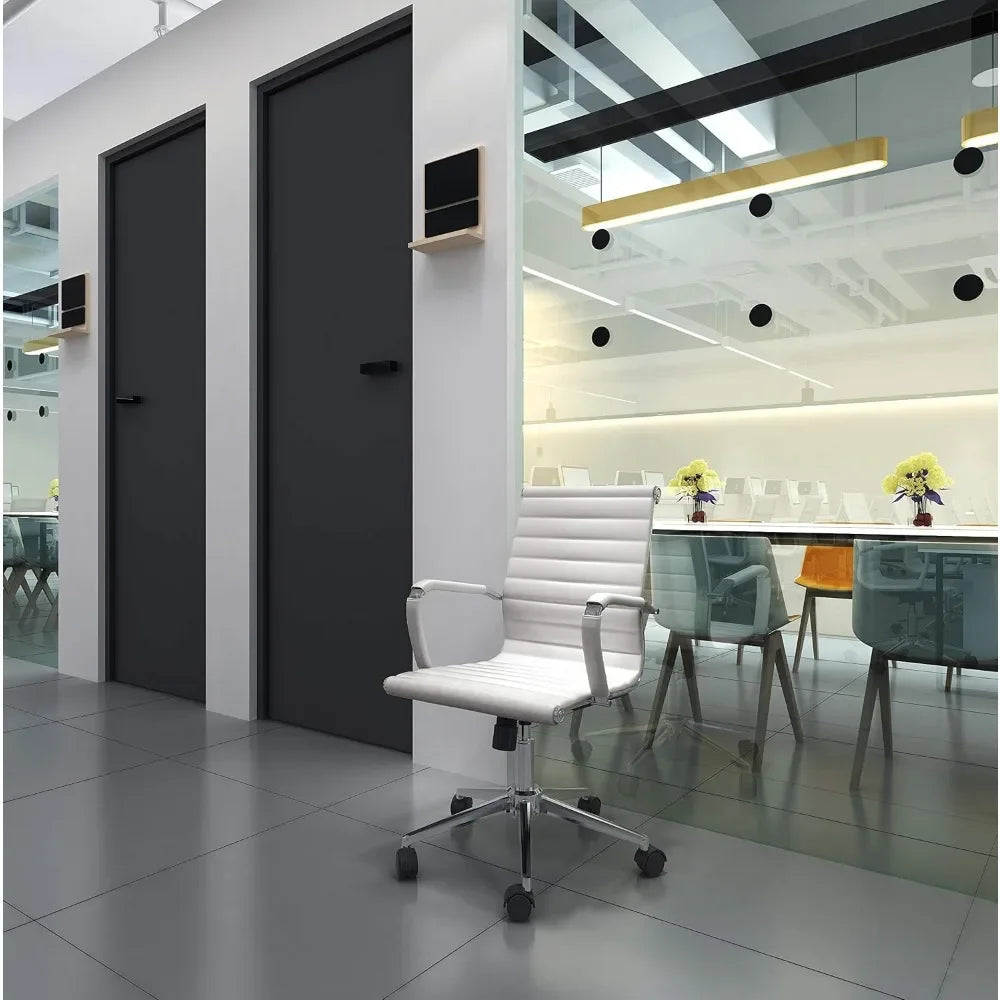 Mid back size with modern ribbed stitching, 360° swivel with adjustable height and tilt locking feature. Tilt up to 20° with tension control or lock in upright position. Strengthened single-piece metal frame for increased sturdiness.