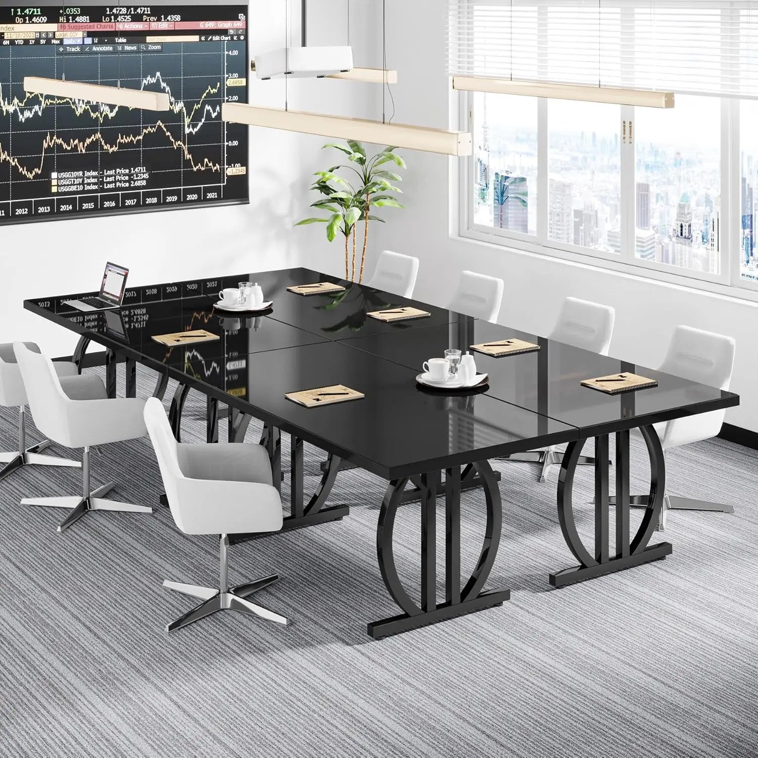 The desk's modern, minimalist design is a fantastic addition to any home office. The geometric base and glossy black tabletop are not only stylish but also versatile, blending seamlessly into any decor with a length of 63'' and depth of 31.5''. This executive desk is roomy enough for multiple monitors, laptops, and other office necessities. The 29.5'' height ensures ample legroom and space for additional items.