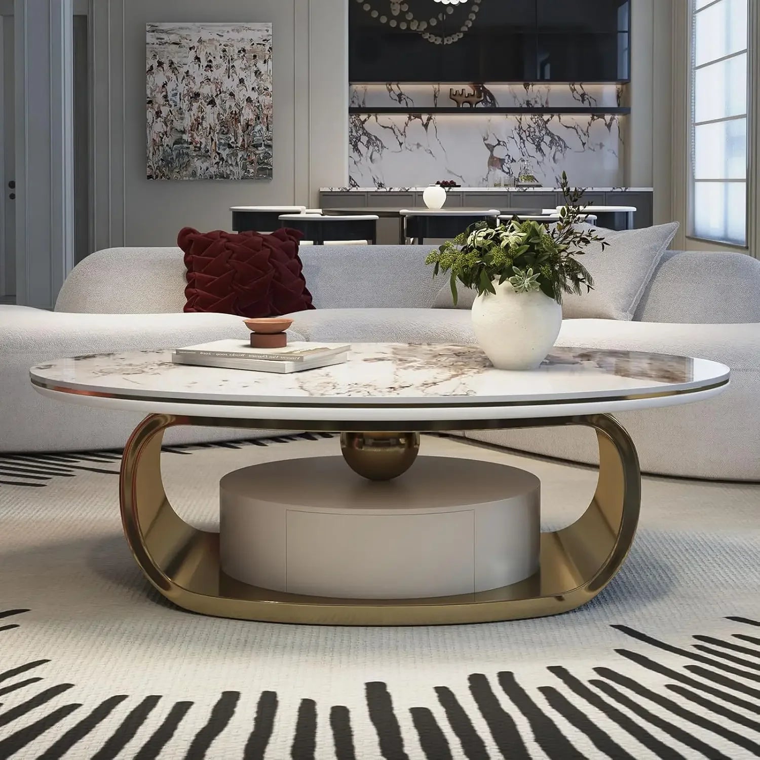This oval coffee table is perfect for interior decoration. The combination of marble pattern countertops and stainless steel frames brings a powerful visual impact. The marble pattern on the top makes the space unique in terms of decorative effect. The stainless steel surface is brushed to present a high-grade metal texture and enhance the overall appearance of the coffee table. This unique oval coffee table is equipped with two drawers, each designed to provide discreet and organized storage for various items. Spacious desktops can put more items, such as tea sets, magazines, remote controls, etc., to meet different needs of use.