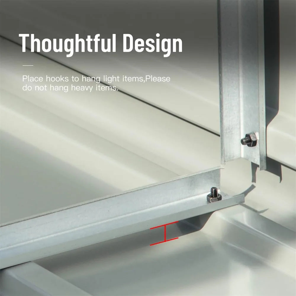 Constructed with high-quality galvanized metal, this tool shed offers excellent rust and corrosion resistance. The leak-resistant top, tight construction, and thick walls ensure durability and maintenance-free use for years to come. The gable sloping roof design features grooves that allow rainwater to flow down quickly, preventing water buildup and protecting your belongings during thunderstorm weather. The spire structure roof, with a supporting beam in the frame, enhances the shed's overall firmness and durability compared to smaller sheds without a beam. The shed is designed with 10 air vents in the front and back, a total of 20 air vents, promoting proper air circulation and keeping the interior dry.