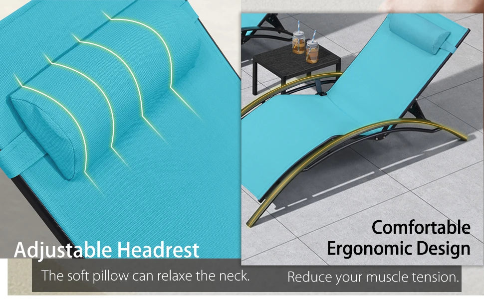 This patio chaise lounge set of 3 (2x Chairs and 1x Table) can be adjusted to 5 different positions according to your needs. No matter which position you choose, the removable pillow of the patio chaise lounges will ensure that your head and neck are well supported. The pool chaise lounge chairs can be stacked to save your outdoor storage space, which is both convenient and practical. After you finish using them, you can fold the chaise lounges and put them in the trunk of your car or lean them against a corner of the wall. Then you can unfold them when you need to use the chaise lounge outdoors again.