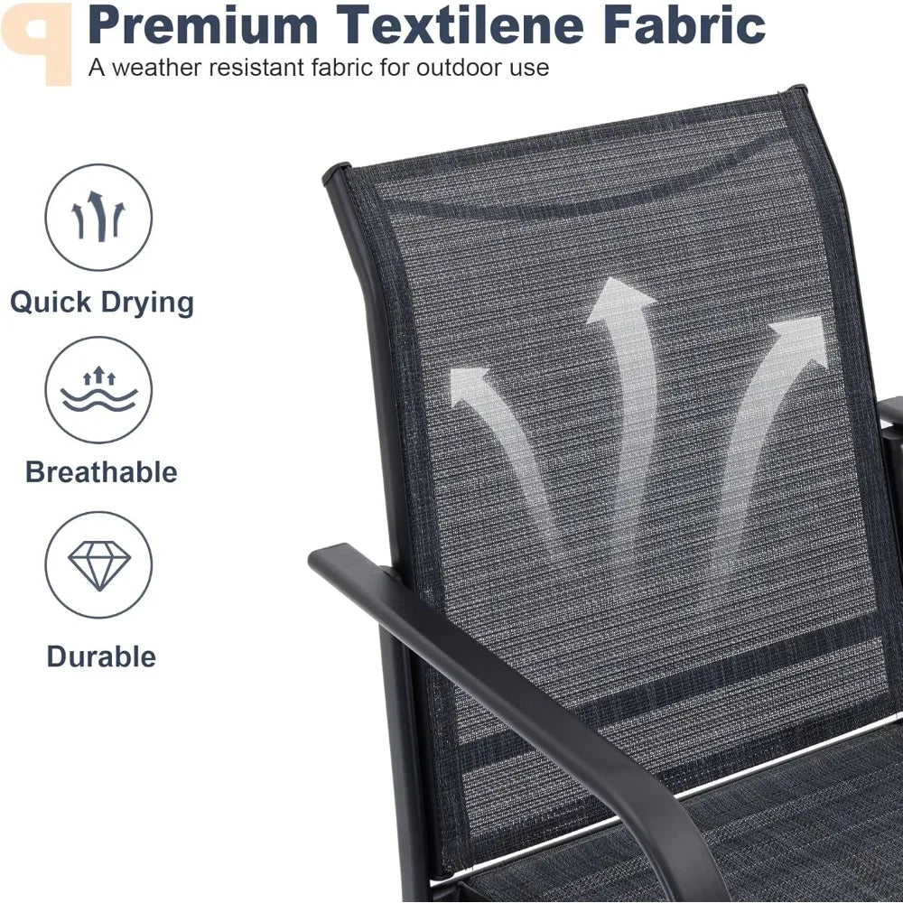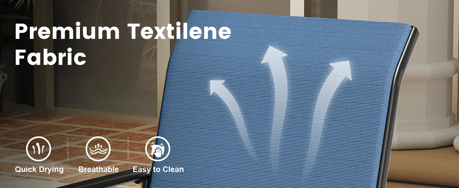 Stackable Textilene Chairs: These chairs are designed to be easily stacked and stored, allowing you to maximize your space when not in use. Made of breathable Textilene fabric, it keeps you cool and comfortable.