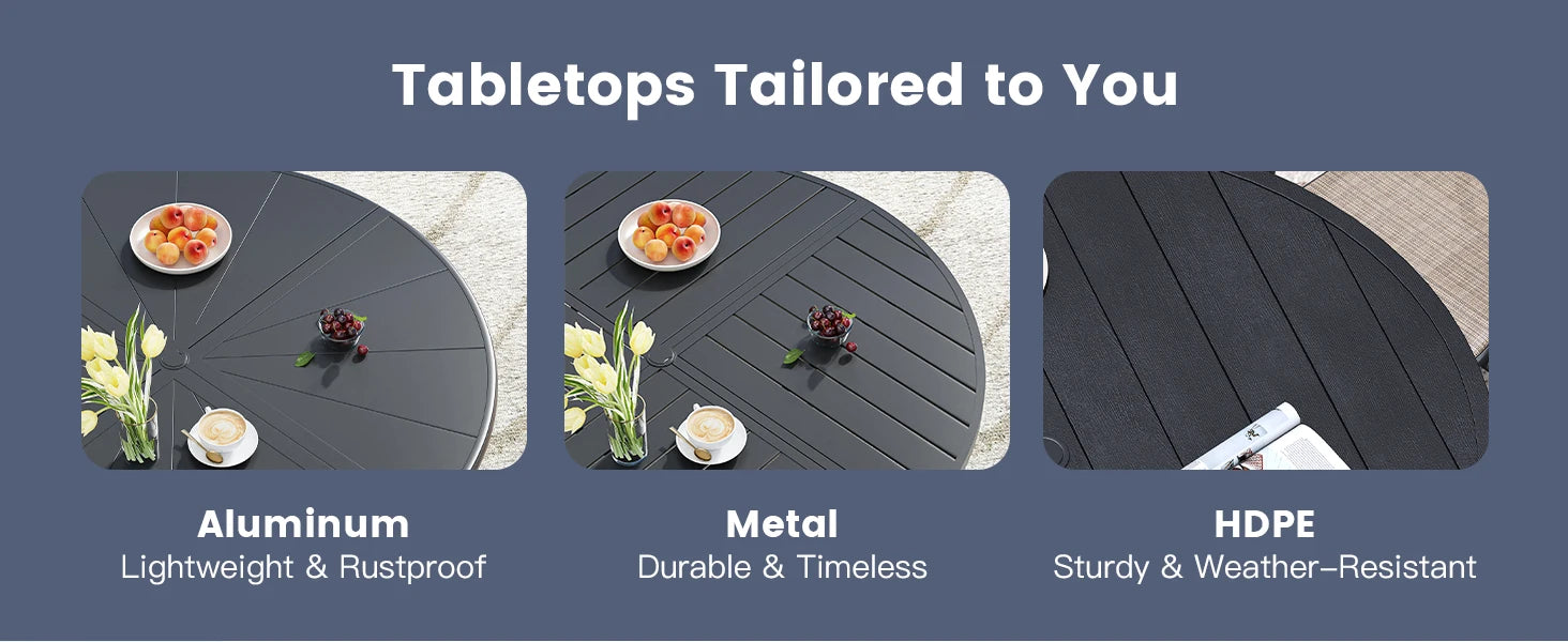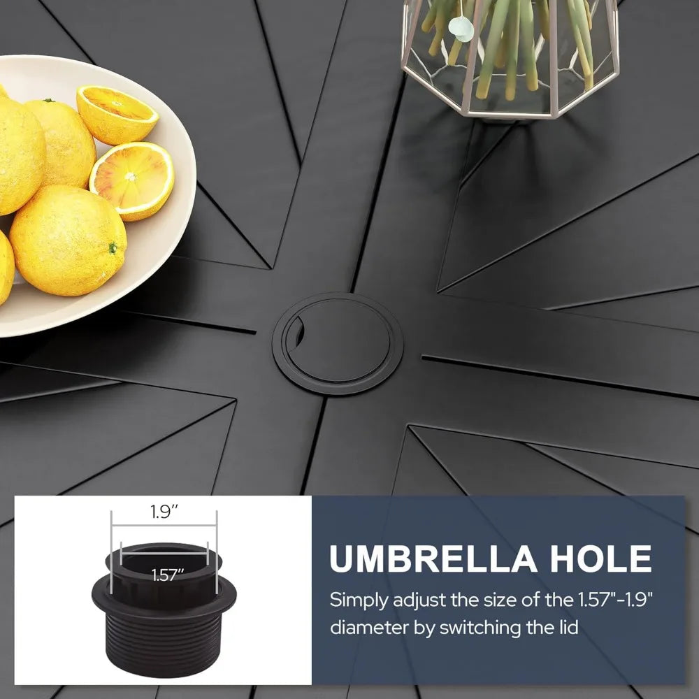 The 5-piece aluminum outdoor round dining table and stackable textilene chair set match any decor, creating an elegant dining area with superior quality for your backyard, porch, balcony, or deck. An adjustable umbrella hole on the tabletop fits most umbrellas, ensuring outdoor leisure time even on hot and rainy days. The metal frame of the table and chair is processed by a high-performance powder-coating technique, extending protection against rust, scratches, rain, and improving the durability of the product.