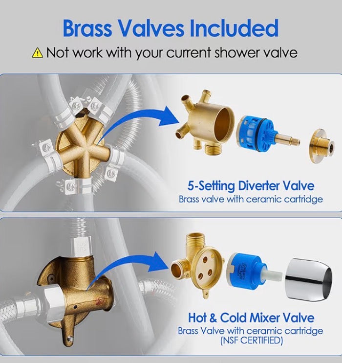 This all-in-one shower panel system with LED lights include rainfall shower, a waterfall shower, body massage jets, a handheld, and a bathtub spout to meet different shower needs. Each function runs independently for steady water pressure (requires at least 40 psi. This solid shower panel is constructed of stainless steel for durability and corrosion resistance, with a copper valve and diverter featuring a ceramic cartridge, ensuring dependability and longevity.