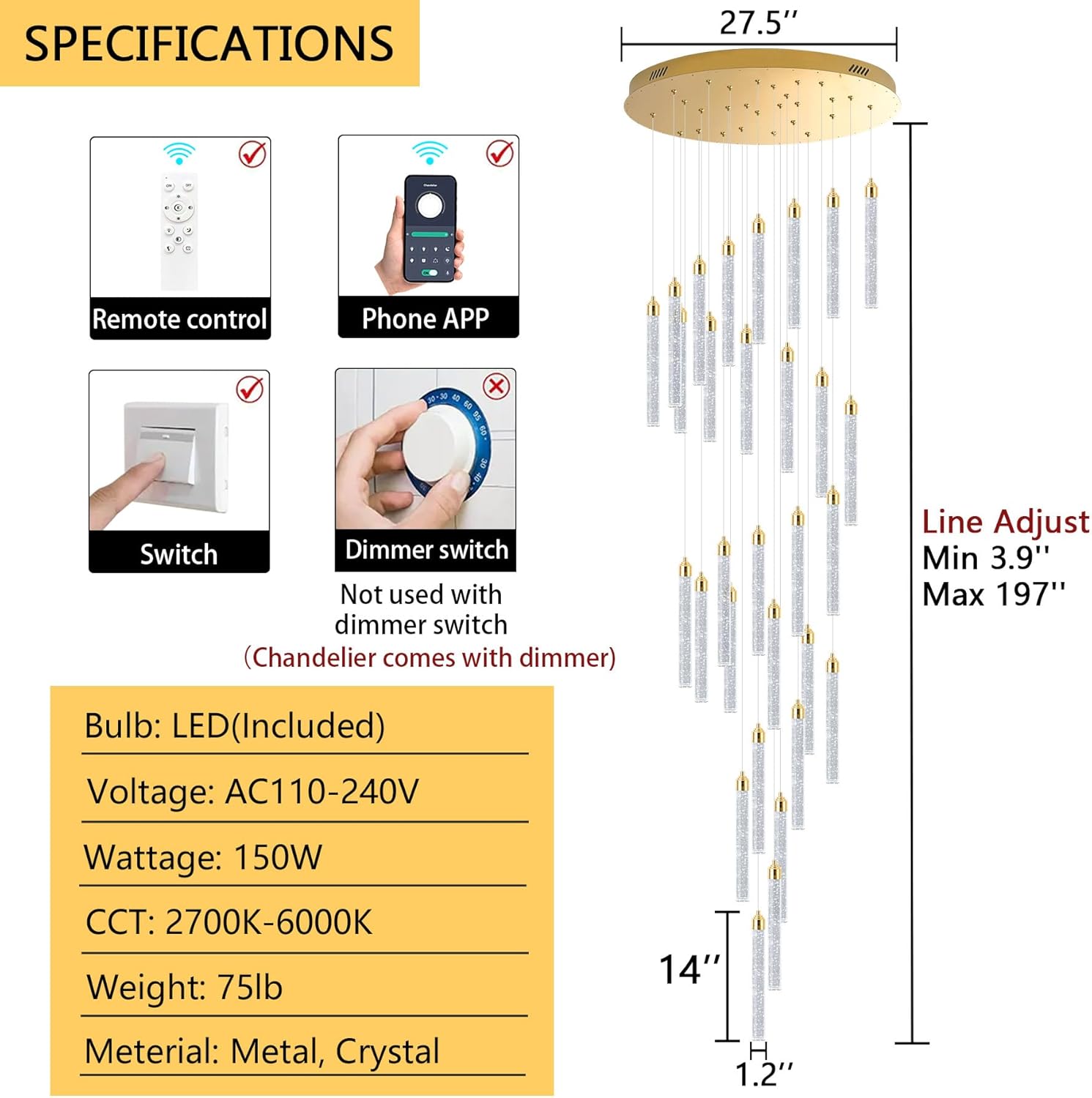 Modern minimalist design style, classic metal with sparkling bubble crystals, the mirror ceiling canopy reflects the charming lighting, sure to catch anyone's eye. It can be widely used in the living room, dining room, hallway, entrance, and stairwell. This crystal chandelier comes with a 150W LED dimmable light source (dimmer included) and can be used directly on AC110V/120V/220V/240V. It also has a remote control for lighting color and brightness.