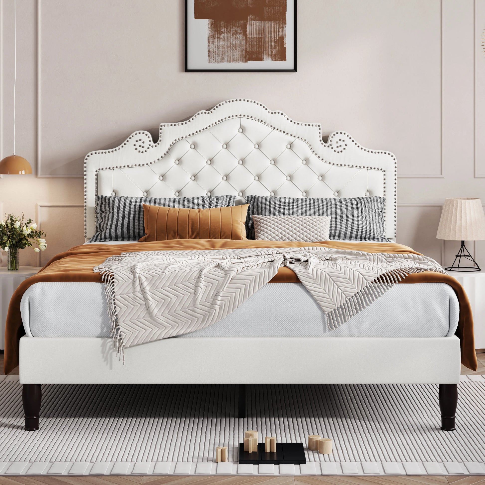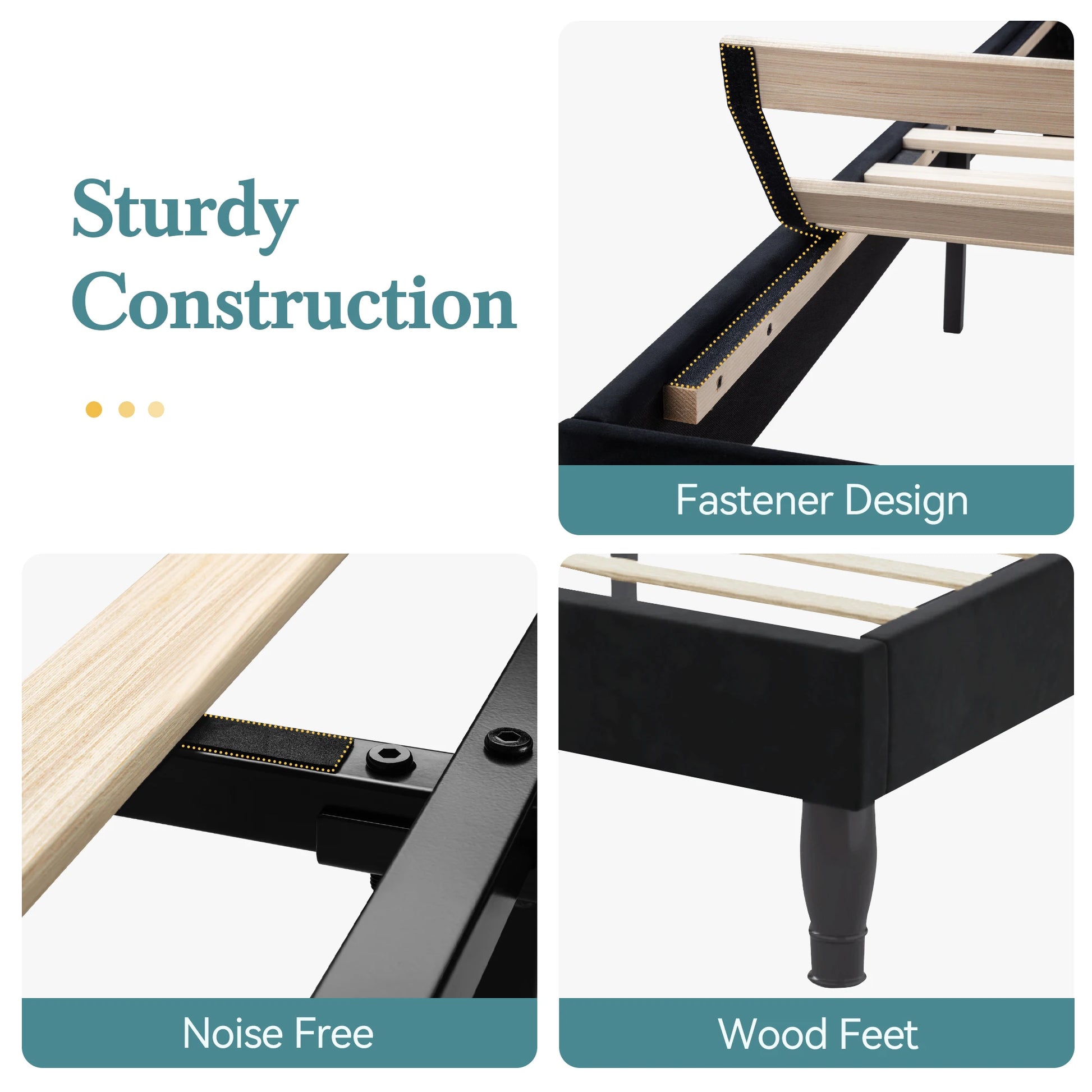 This headboard frame is made of velvet fabric with rivet decorations, resembling a crown, adding a luxurious and elegant atmosphere to your bedroom. The comfortable bed slats of the bed frame are made of high-quality wood, providing sturdy support to keep your mattress in good shape and comfort. **Box Spring Not Required**