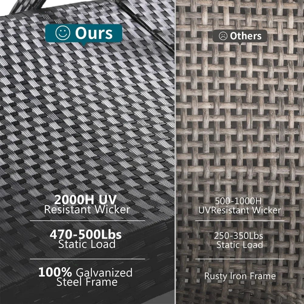All-Weather Wicker & Heavy-Duty Frame: Made from 2000-hour UV-tested wicker, these wicker lounge chairs for outside resist fading, rain, and humidity. The galvanized steel frame supports up to 470 lbs, ensuring durability for patio chaise lounge chairs.