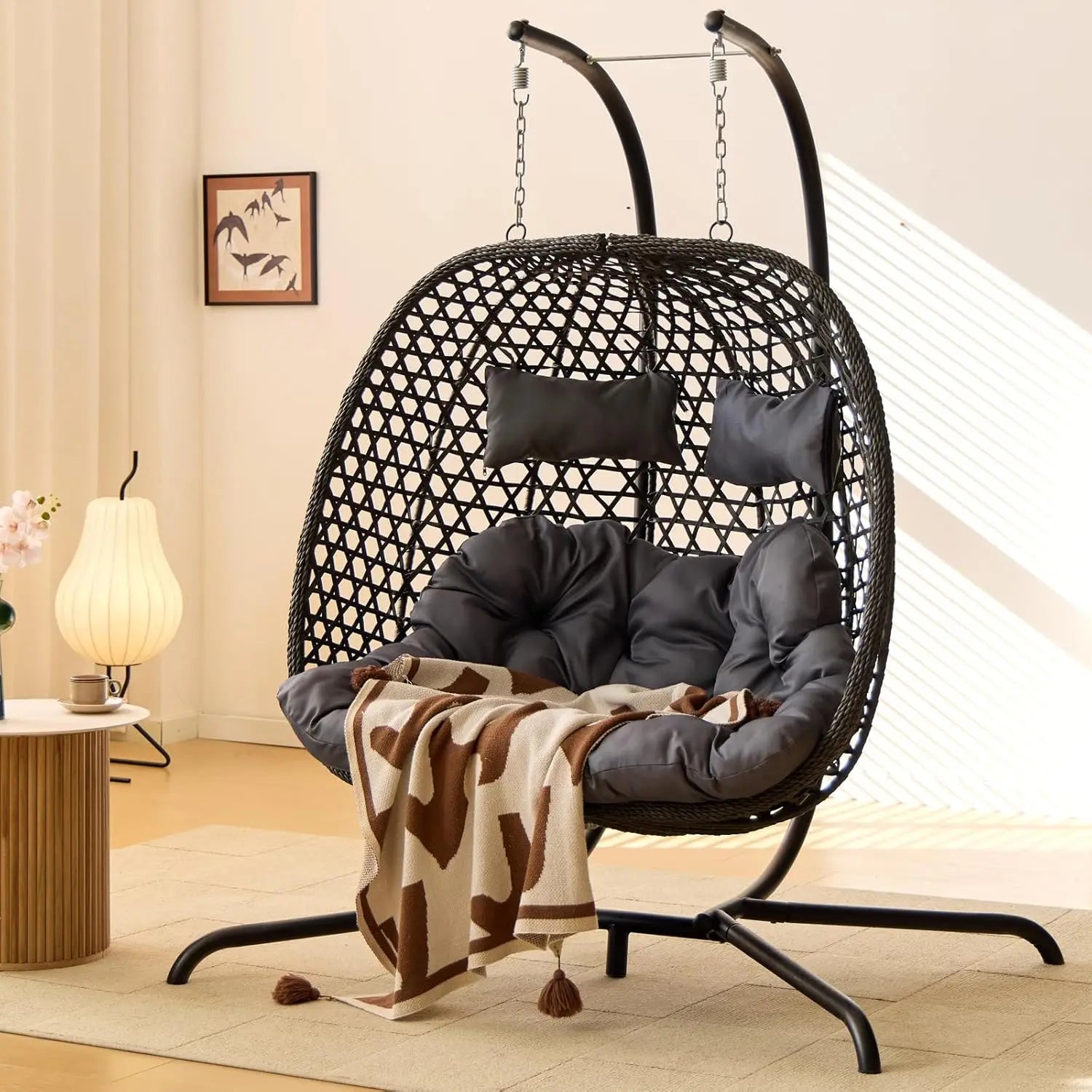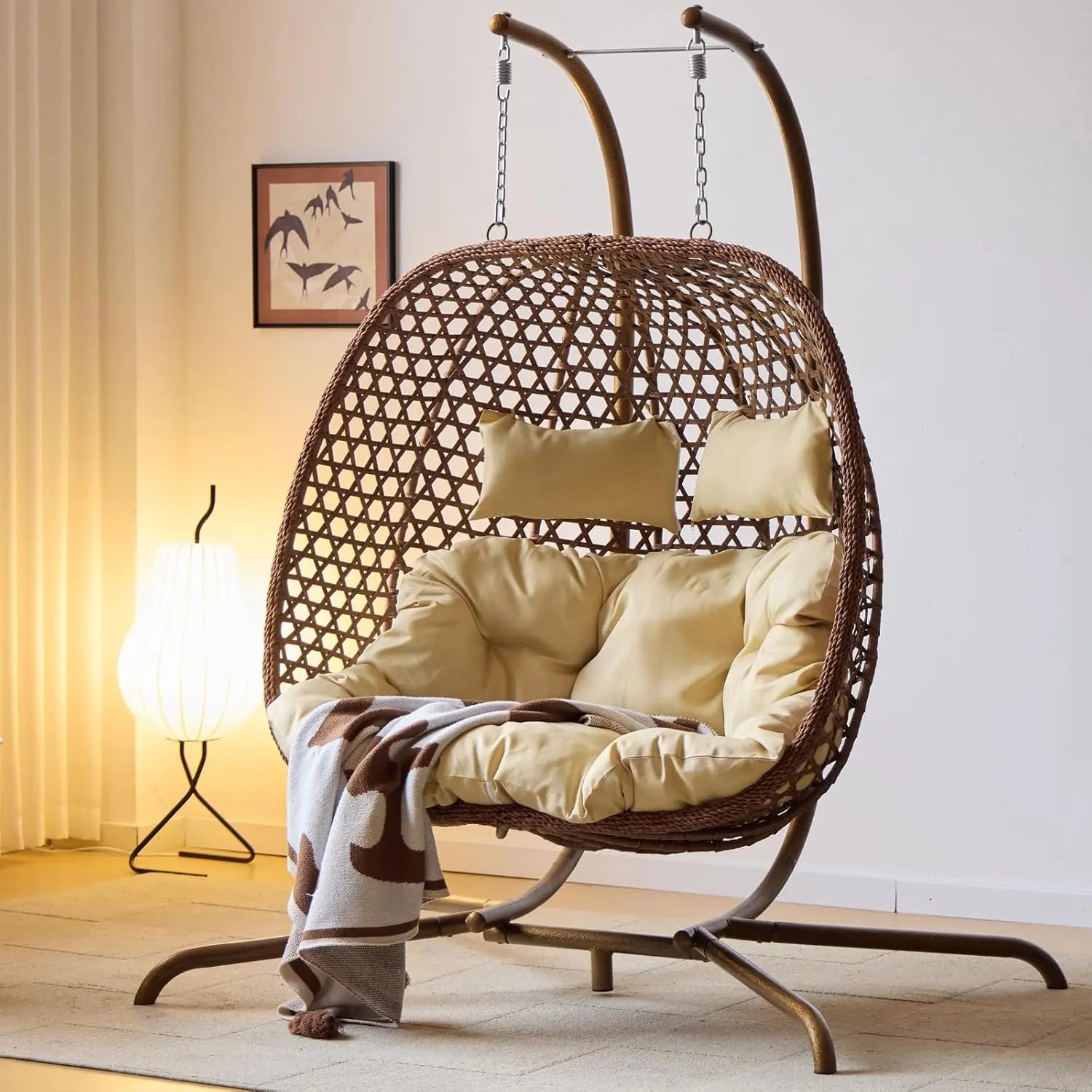 Our upgraded hanging chair for the bedroom or outdoor is designed with a reinforced hexagon hand-knitted rattan basket, ensuring stability and longevity with UV-protected polyethylene rattan wicker wrapped around a steel frame. the swinging chair for the bedroom features better durability, weather resistance, corrosion resistance, and is easy to clean. Power coating + electrophoretic paint steel stand avoids the rusty problem, prolongs service life.
