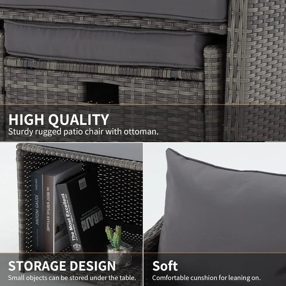 Ergonomic Design: The backrests of the two single wicker chairs are slightly curved to provide better support for the human body. The backrest pad can protect your waist and improve your sitting experience. The footrest with thick patio furniture cushions can directly support your feet without height differences, or it can be placed on each side of the table to become a terrace conversation kit, giving you more opportunities to enjoy leisure time with friends and family.