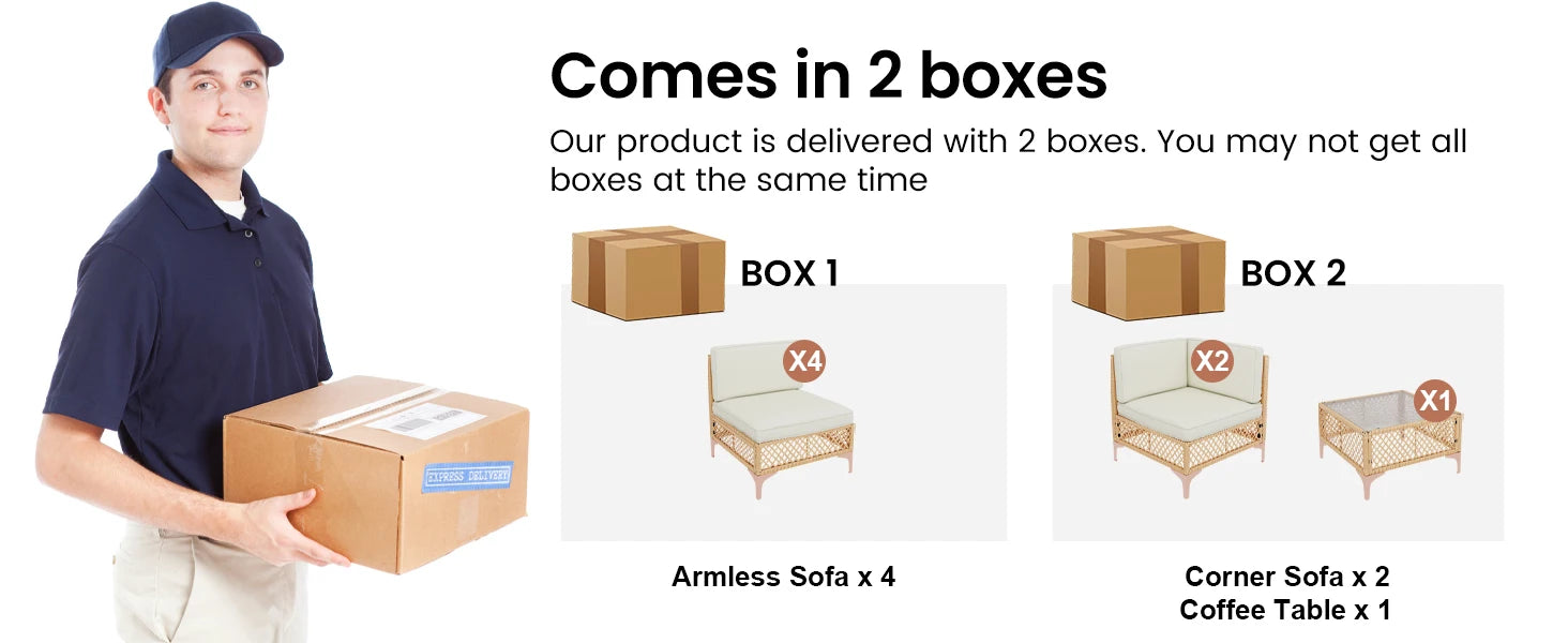 Package Includes: 1x Sofa, 1x Coffee Table, Cushions, Tools, and Instructions.